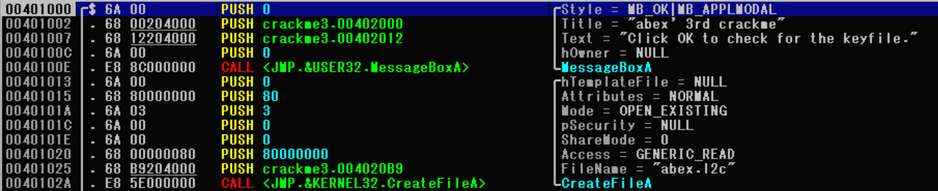 MessageBoxA는 일관된 것을 보니 메시지 창을 띄우는 함수인 것 같고 keyfile을 체크해보라고 했으니까 CreateFileA 함수를 이용하면 해결할 수 있을 것 같다.