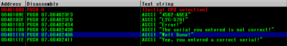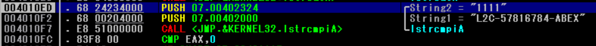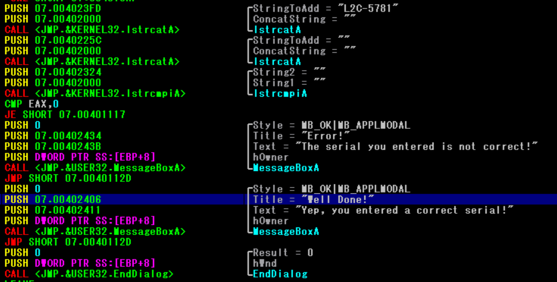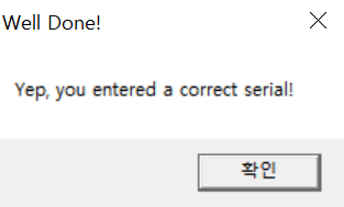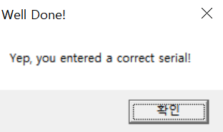 성공 메시지가 출력되는 부분으로 이동하는 것으로 보아 저게 serial 키 포인트인 것 같다.