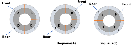 enqueue는 새로운 데이터를 추가하는 연산이고, dequeue는 기존 데이터를 반환하는 연산이다. 추가로 dequeue는 데이터를 삭제하면서 반환하고, peek는 삭제하지는 않고 값을 반환만 하는 연산이다.