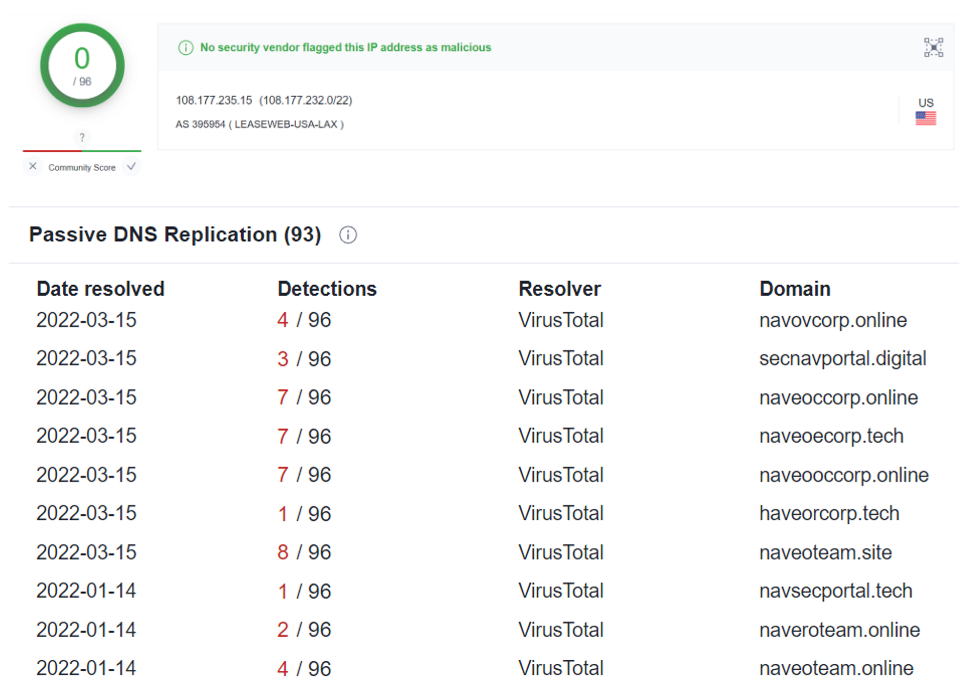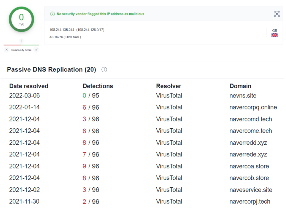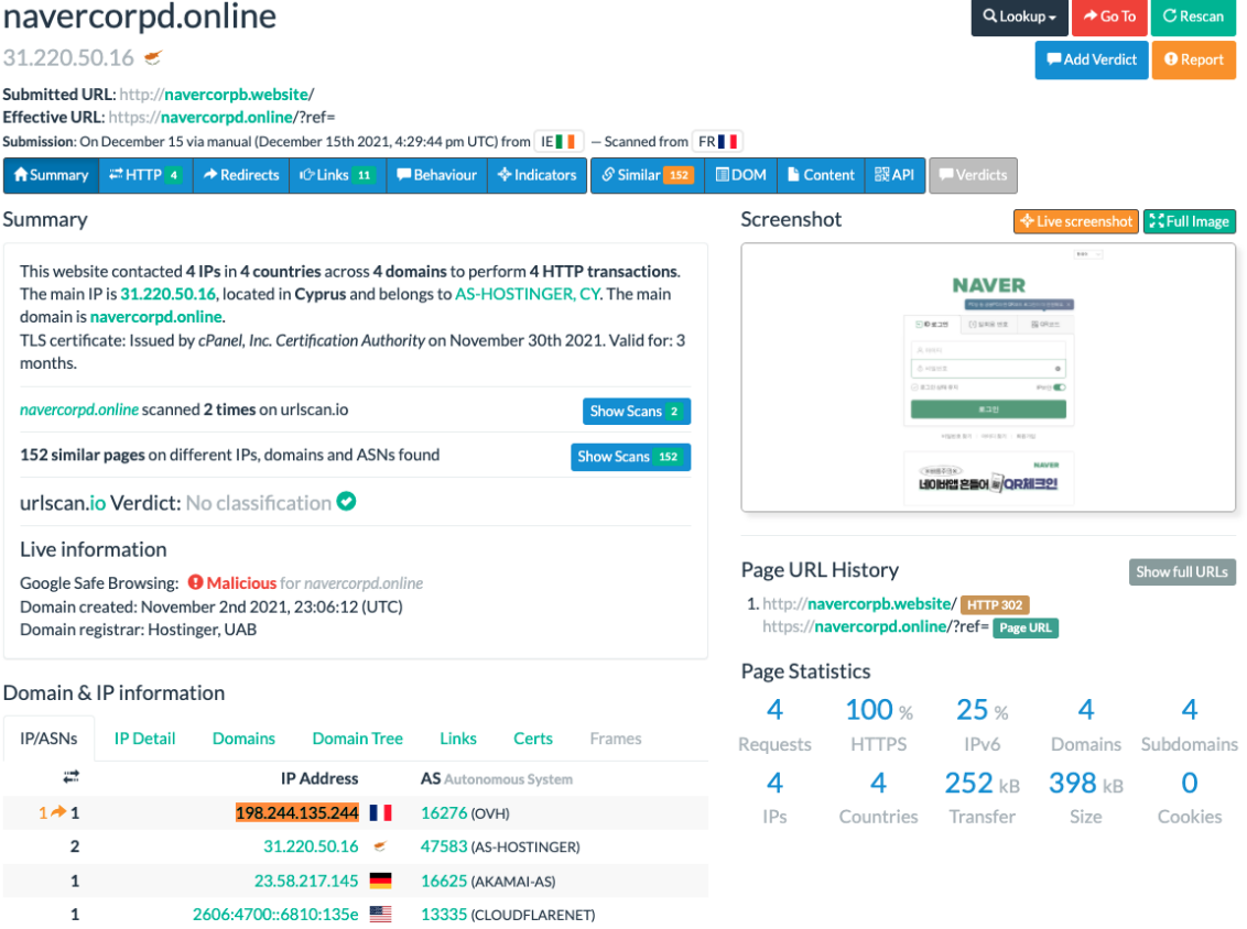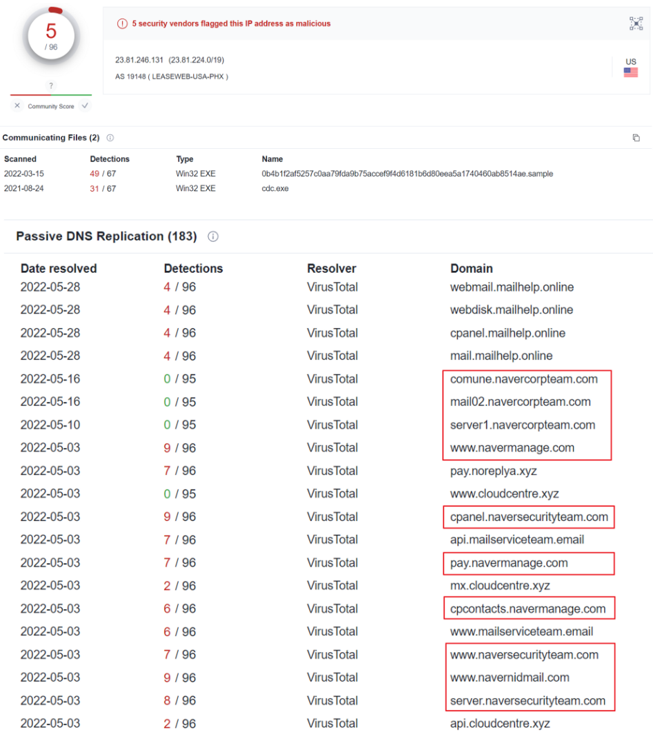- 공동 등록자(mouraesse@gmail.com)가 있는 다수의 네이버 테마 피싱 페이지가 위 ip로 식별