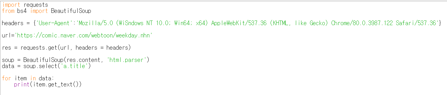 data 변수는 가져올 웹툰 명 부분을 봤을 때 a 메타의 title 클래스가 공통적으로 있는 것을 확인 후에 적어주었다.